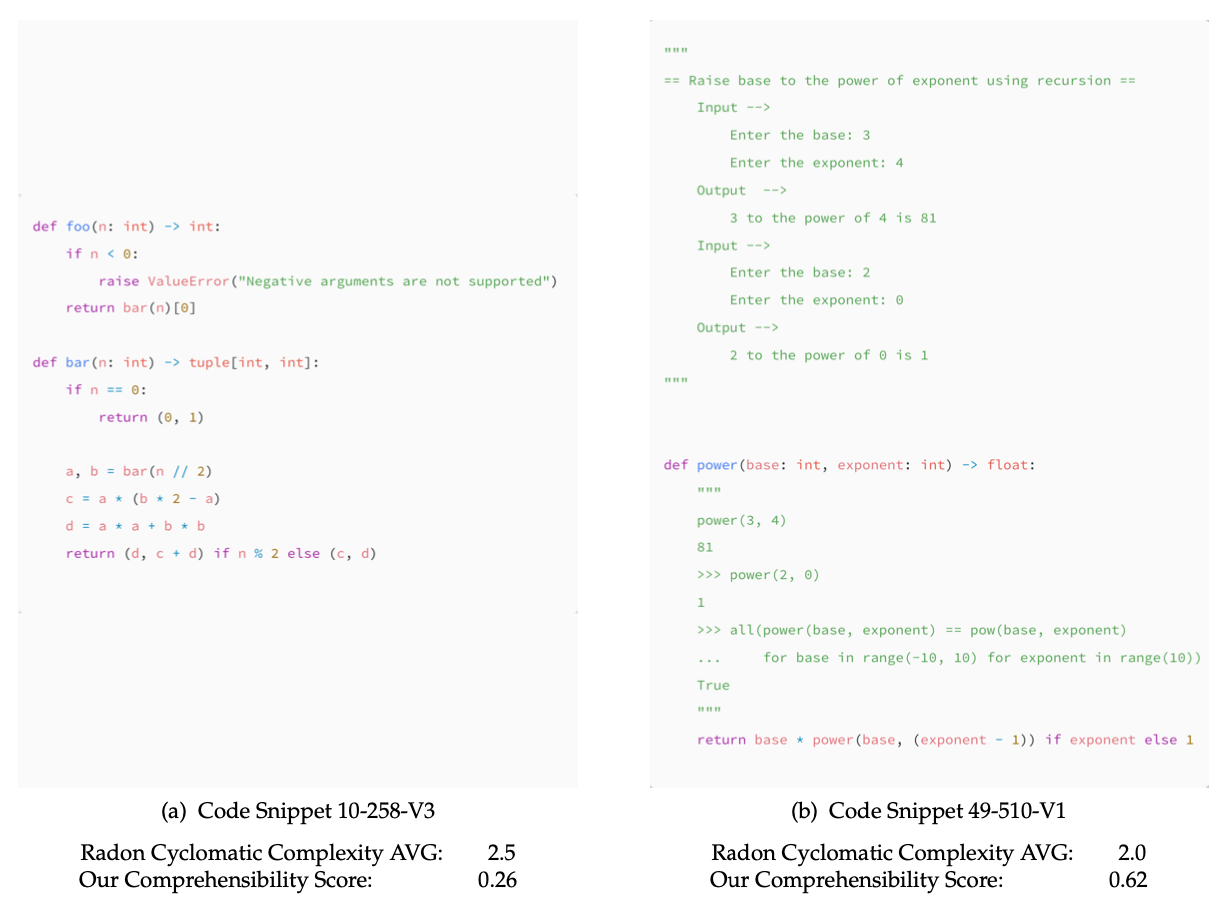Example of two code snippets with equal cyclomatic complexity but vastly different human comprehensibility.